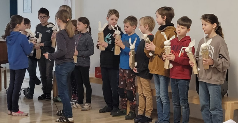 Kinder der Klasse 4b präsentierten ihre beeindruckenden Hasenskulpturen, die sie aus einem Holzscheit, einem Ei, Draht und Gips erstellt haben.